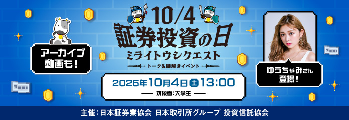 そこで今年の「証券投資の日」は、より多くの方に証券投資に興味・関心を持っていただくため、日本証券業協会、日本取引所グループ、投資信託協会の三団体共催で、大学生を対象にトークショーや謎解きコンテンツ等を展開いたします。
