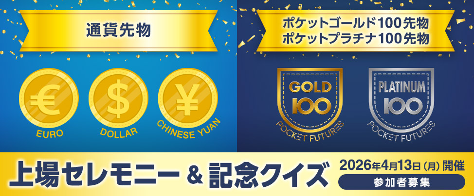 大阪取引所は、2026年4月13日上場予定の金・白金のポケット先物取引及び通貨先物取引の上場を記念して新商品上場セレモニー及び記念クイズを大阪取引所(大阪証券取引所ビル1階アトリウム)にて開催します。