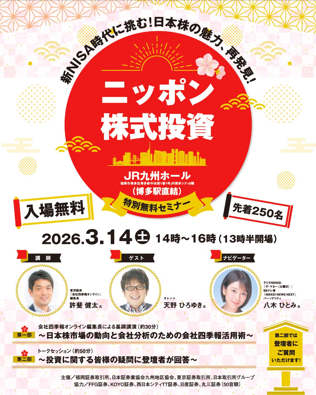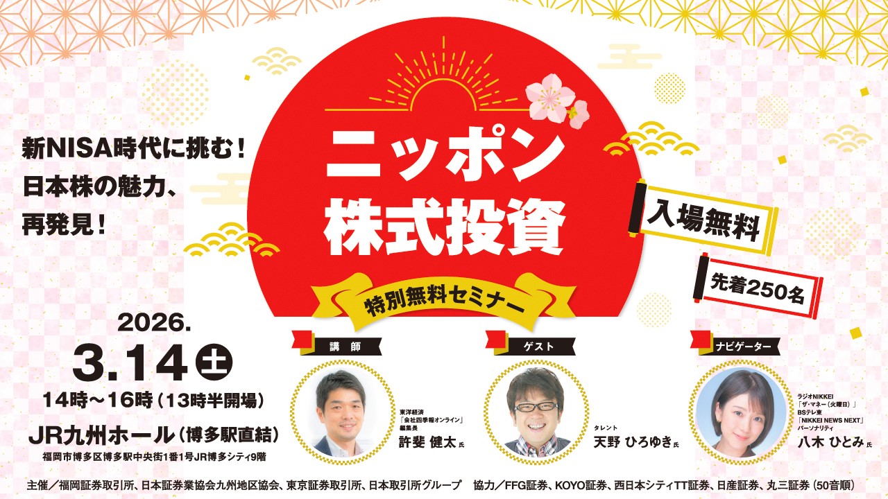 福岡証券取引所、日本証券業協会九州地区協会、東京証券取引所、日本取引所グループでは、この度「ニッポン株式投資 〜新NISA時代に挑む日本株魅力の再発見〜」をテーマに、共催イベントを開催することといたします。