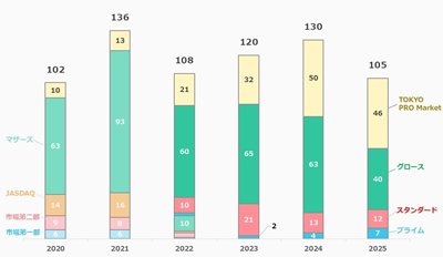 2025年に新たに東京証券取引所(以下、「東証」)へ上場した会社は105社であり、新規上場への意欲は継続的に高い水準で維持されています。
