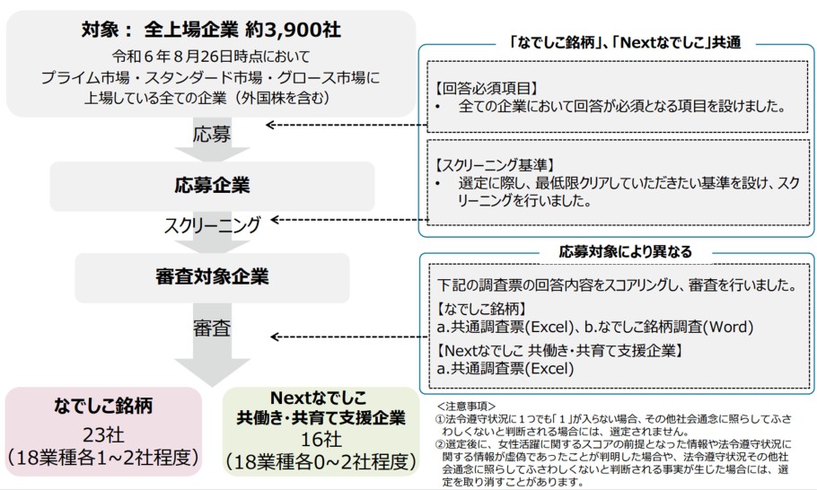 企業価値向上につながる女性活躍のためには、「採用から登用までの一貫したキャリア形成支援」と、「共働き・共育て支援(性別を問わない両立支援)」を両輪で進めることが重要という考えのもと、そのような企業を「なでしこ銘柄」として選定しました。