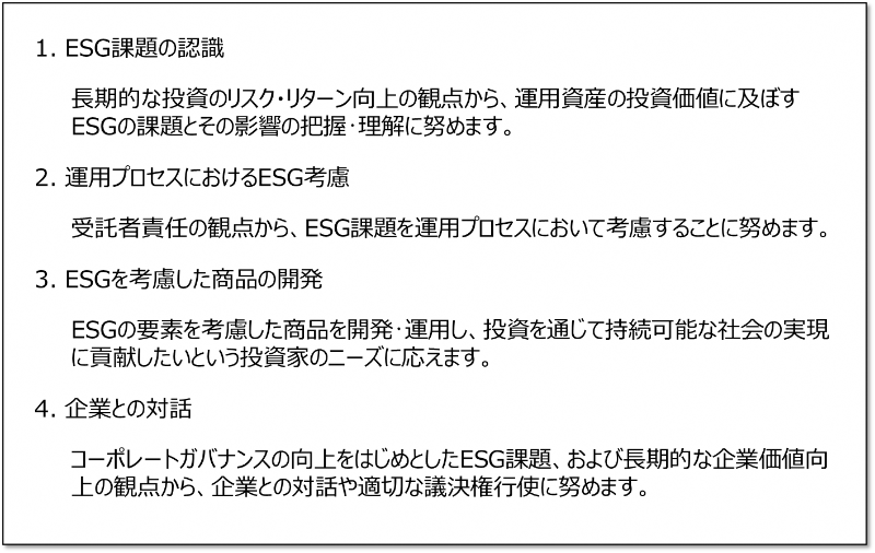 当社は、資産運用の調査・投資判断において、ESGにかかわる課題を適切に考慮することが、長期的な投資収益の改善のみならず、持続可能な社会の実現、企業価値の向上および資本市場の健全な発展についての社会的責任を果たすことにつながるものと考え、以下の取り組み方針を掲げています。