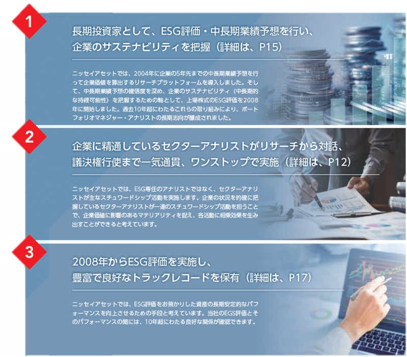 ニッセイアセットでは、2008年からESG評価に取り組み、スチュワードシップ活動の土台を築いて参りました。資産運用に関わる専門家として、長期的な投資収益の改善に繋げ、「お客様から長期にわたって信頼頂く」ことを実現するために実施してきた当社のスチュワードシップ活動には主に3つの特徴があります。