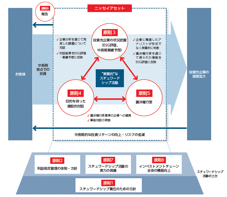 当社は、お客様の中長期的な投資リターン向上とリスクの低減を目的とした調査・投資活動を運用プロセスの中核としており、このプロセスにおいて重要となる「投資先企業の状況把握」、「目的を持った建設的対話」、「議決権行使」を通じてスチュワードシップ責任を果たし、投資先企業の価値拡大に繋げることでお客様と投資先企業の共創(Co-Creation)が果たされるよう努めています。