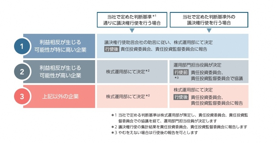 - 「利益相反の生じる可能性が高い局面」:当社の大口取引先、日本生命の株式保有比率が高い企業等に対する議決権行使および対話
