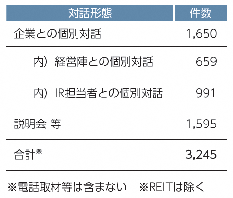 当社では、上述した独自のESG評価等を用い、投資先企業の持続的成長に向けた当該企業の状況の把握を行います。この過程において認識した中長期的な持続可能性に向けての課題を対話アジェンダとし、投資先企業と意見交換を行い、認識の共有化に努めますが、投資先企業と当社との考え方に相違がある場合には、投資家としての意見を伝え、建設的な議論を行うことで、投資先企業の価値の向上とリスクの低減を図ります。2019年度は、投資先企業や投資候補先企業とは年間1,650件、企業経営の舵取りを担い企業価値に大きな影響を与えうる経営陣の方々や、社外の独立した客観的な立場から経営を監督する社外取締役の方々とは659件の個別対話の場を持つことができました。