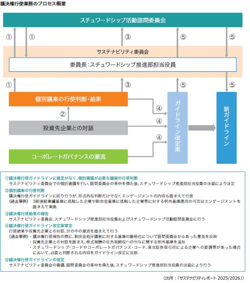 - これらを判断基準として規定した詳細な議決権行使ガイドラインを公表しています。また、議決権行使においては企業とのエンゲージメントも考慮しています。