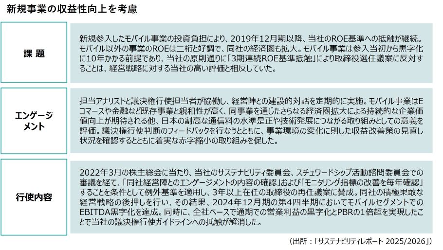 - 当社が議決権行使において重視するポイントは、①株主利益を尊重した質の高いガバナンス、②持続的成長に向けた効率的な株主資本の活用、③企業価値棄損につながる事態が発生した場合の適切な対処、の3点です。