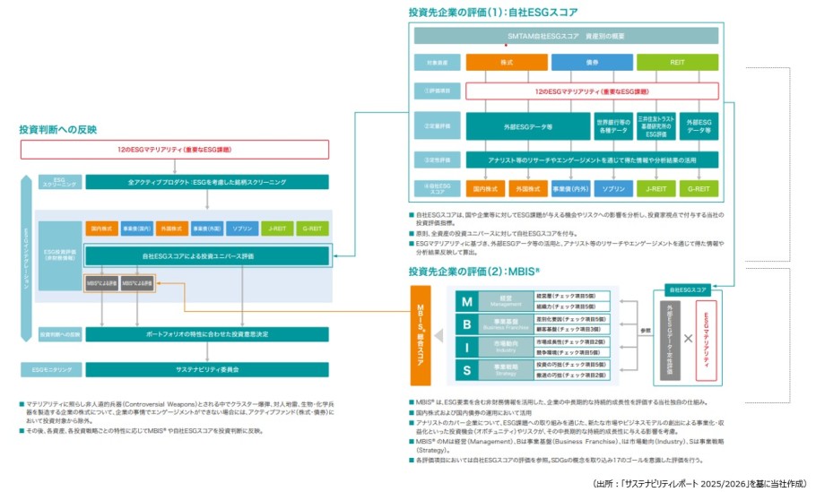 - 当社では、「ESGマテリアリティ」に照らし合わせた、独自及び外部データによる定量評価を加味したESG投資評価をポートフォリオの特性に合わせて考慮することで投資判断に反映し、ESGインテグレーションを実践しています。
