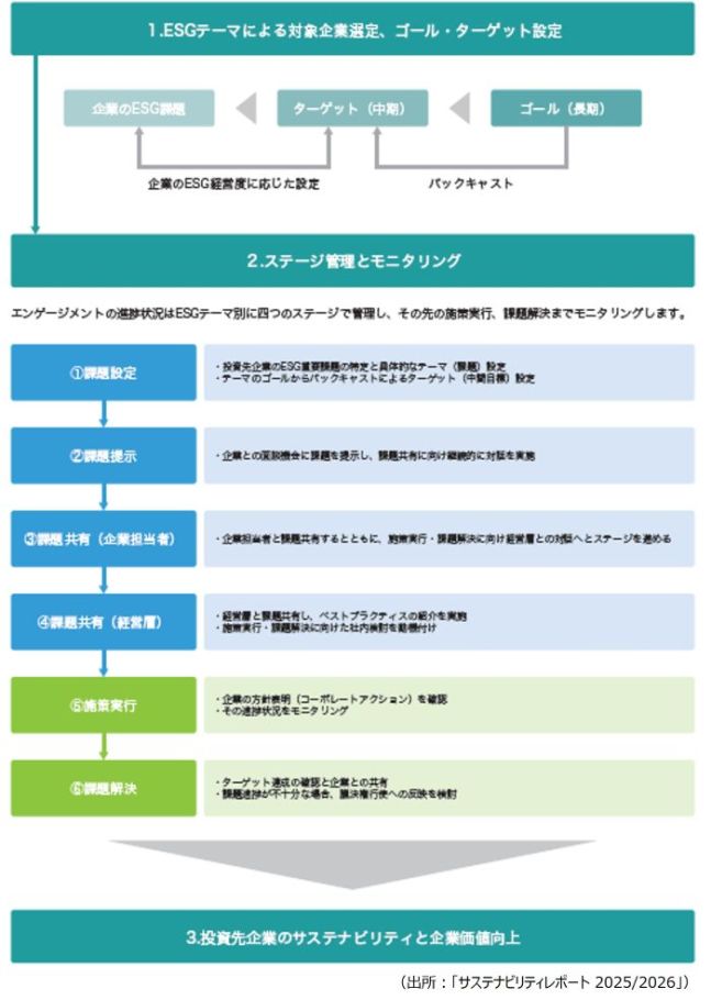 - これまでのエンゲージメントの蓄積による「企業や業界動向への深い理解や知見」、国内外イニシアチブを通じて得られる「ESGに関するグローバル潮流に関する知見」を基に効果的なゴールとターゲットを設定し、実効的なエンゲージメントを行います。