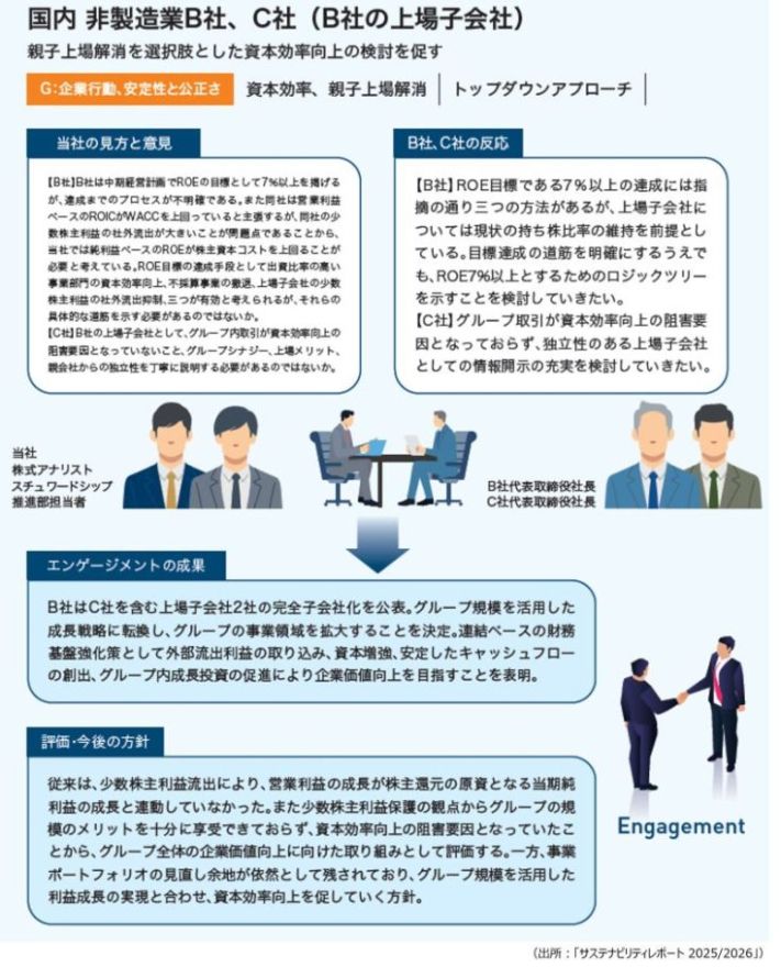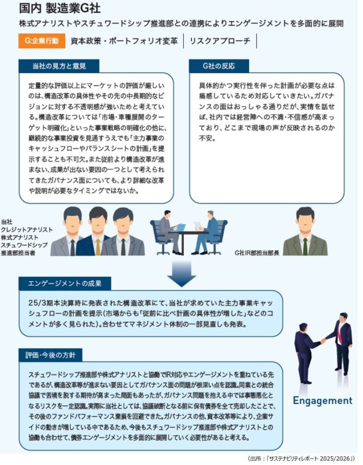 - 財務健全性や資本効率のバランスなど債券に特有の課題についてはクレジットアナリストなど債券運用に関わる人材が主導し、スチュワードシップ推進部や株式アナリストなどと連携しつつ、債券市場の特性を踏まえた対話を進めています。