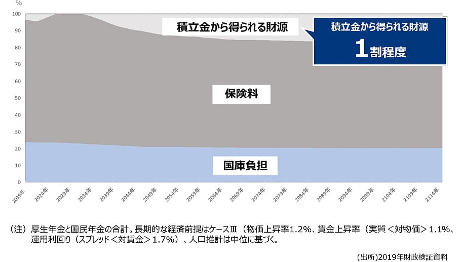 GPIFはこの積立金を国内外の資本市場で運用して増やしています。年金積立金の運用収益や元本は概ね100年の年金の財政計画のなかで、将来世代の年金給付を補うために使われます。年金財源全体のうち、積立金から賄われるのは1割程度です。年金給付に必要な積立金は十分に保有しており、ある特定年度に評価益又は評価損が発生したとしても、それが翌年度の年金給付額に反映されることはありません。
