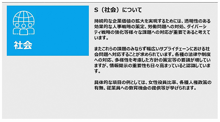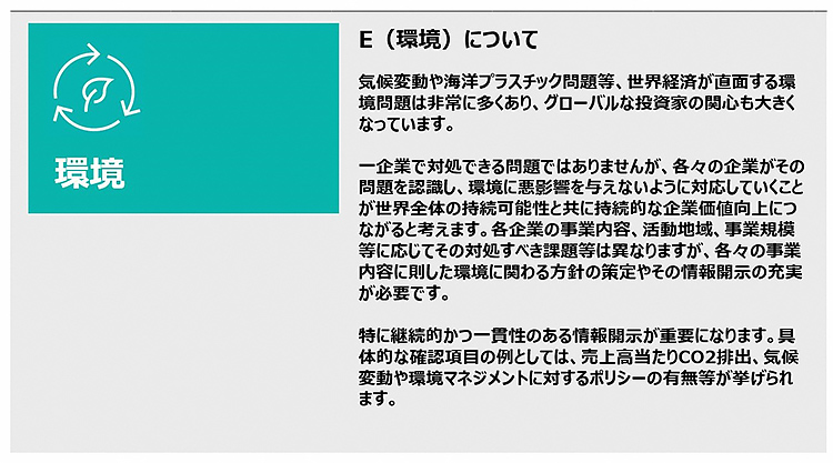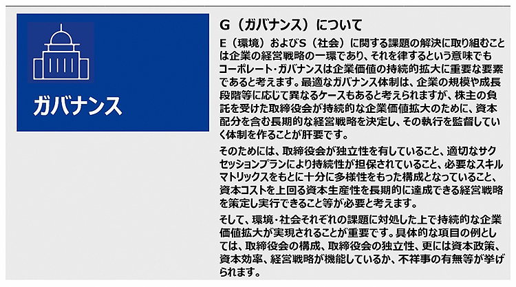 長期的な持続的成長を分析する上では、ビジネスモデル/経営戦略の優位性と差別化された技術を含む革新性をベースとし、強固なフリーキャッシュフローの創出、資本の適切な配分による成長性および資本生産性の向上、配当を含む余剰資金の配分政策等が必要です。そして、その持続性を担保するための重要な要素が企業のESGに対する取り組みとそのパフォーマンスにあると考えております。特に、コーポレート・ガバナンスがE(環境の保全や改善への取り組み)とS(従業員を含む様々なステークホルダーに対する配慮)を規定するものとして重要です。このような企業のESGへの取り組みが、その企業価値拡大の持続性を高めることにつながると考えます。そして、その取り組みは一企業を超えて、究極的には社会全体の持続性を高めることに繋がることになり、投資家の責任としてESGを投資プロセスに統合することが求められてきています。