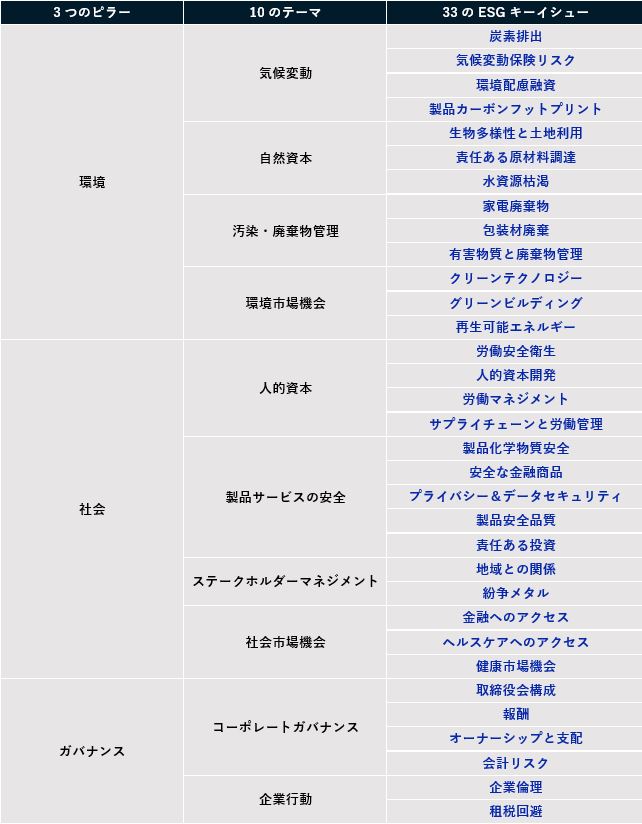 MSCI ESG格付けにおける各E(環境)、S(社会)、G(ガバナンス)のキーイシューは以下に示す通りです。