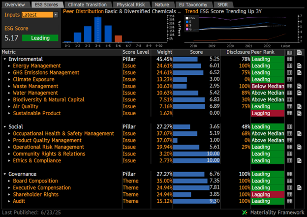 ブルームバーグのESGスコアは、財務的にマテリアルな業種別の環境・社会リスクと機会、およびガバナンスの政策や慣行を各国固有の規則や規制で調整した上で測定します。
