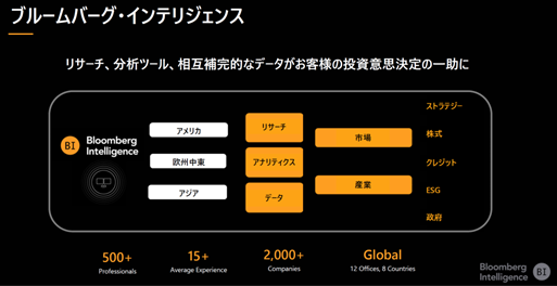 ブルームバーグの投資リサーチ部門であるブルームバーグ・インテリジェンス(BI)は、135以上の業種と2000社以上の企業・業種・世界市場を対象に、戦略、株式、信用力、市場構造、政府、訴訟、ESGの各分野について独立した分析を提供しております。BIの500人を超えるアナリストは、ブルームバーグ独自および第三者機関によるESGデータなどを活用して、各業種にわたり、パフォーマンスを左右する要因や収益性の傾向を特定しています。また、BIは「BI低炭素移行スコア」も算出しています。同スコアでは、過去・現在・未来の炭素排出源単位に基づいて企業を評価、比較、ランク付けし、企業の将来の排出量を気温変化に連動した業種別ベンチマークと比較分析しています。