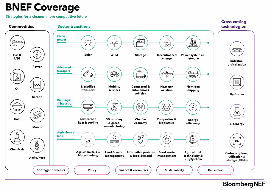 ブルームバーグNEF(BNEF)は、世界のコモディティ市場と脱炭素化経済への移行を推進する革新的なテクノロジーに関する戦略的リサーチプロバイダーです。BNEFの専門家によるリサーチでは、電力、輸送、産業、建築、農業の各セクターがエネルギー移行に適応するための道筋を評価し、コモディティ取引、企業戦略、金融、政策の各分野における専門家が変化に対応し、ビジネスチャンスを創出できるよう支援しております。BNEFは、低炭素経済への移行における企業のエクスポージャー、リスク、整合性を評価する独自の指標を提供しております。これには、BNEF移行エクスポージャー格付け、移行リスク評価ツール(TRACT)、エネルギー供給投融資の比率評価などが含まれ、企業や金融機関がエネルギー移行におけるリスクと機会を特定するためにご活用いただけます。