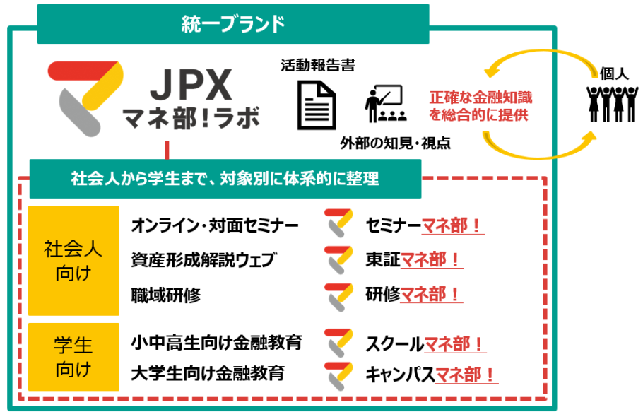 JPXは幅広い世代に対して総合的な金融経済教育を展開するため、統一ブランド「JPXマネ部!ラボ」の下で様々なプログラムを提供しています。一人ひとりのマネー・ライフプランニングに資する正確な金融知識を総合的に提供できるよう、各種教育コンテンツを強化・改善していきます。