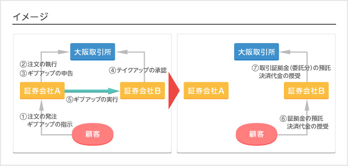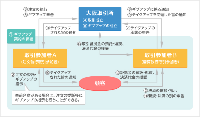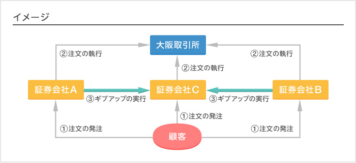 ギブアップ制度とは、顧客が、注文を委託した取引参加者と異なる取引参加者との間で決済関連業務(先物取引の決済時における差金、オプション取引代金及び証拠金等の授受)を行う制度です。