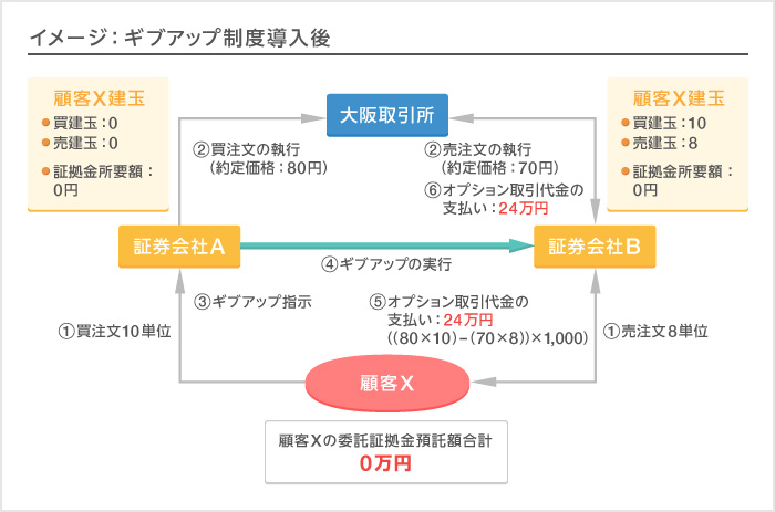 この場合、ギブアップ制度導入前においては、顧客Xは証券会社Aにオプションの購入代金である80万円を支払い、証券会社Bからオプション売却代金である56万円を受け取り、同時に、証拠金160万円を差し入れることとなります。