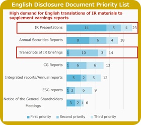 Beyond earnings reports and timely disclosure materials, which have seen increased translation into English due to the mandate, most respondents indicated that priority should be given to translating IR presentation materials. There was also demand for English translations of transcripts of the presentations.
