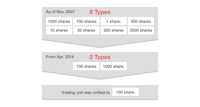 TSE and other domestic stock exchanges have pushed for a single trading unit of 100 shares for the purpose of improving market convenience for investors since November 2007.