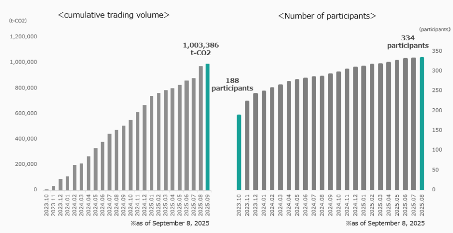 After Tokyo Stock Exchange, Inc. launched the Carbon Credit Market on October 11, 2023, the cumulative trading volume has reached 1 million t-CO2 as of September 8, 2025 with a cumulative total of 1,003,386 t-CO2 (daily average of 2,153 t-CO2). Transactions have been made on 363 out of 466 days (78%), providing continuous trading opportunities and consistent price disclosure.