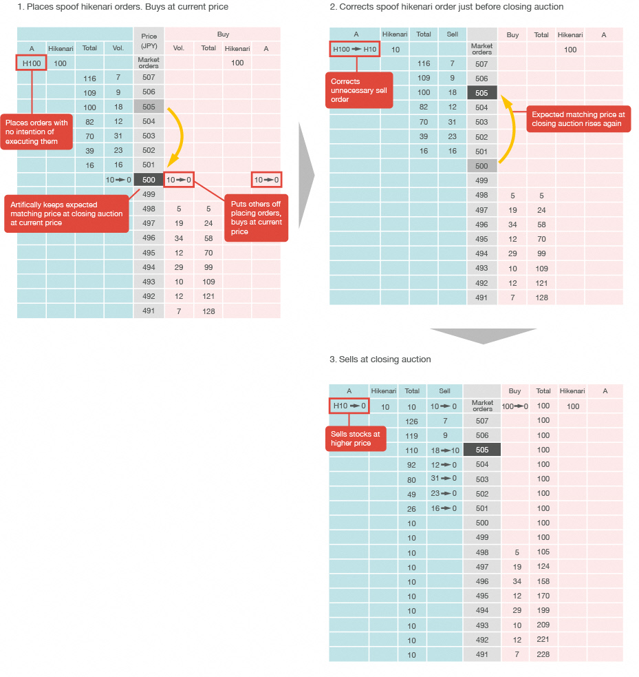 1. Artificially keeps the expected matching price at the closing auction at the current price of JPY 500 by placing 100 units of a "spoof" hikenari order (an order which he has no intention of executing). This puts other investors off placing orders. Investor A buys 10 units of the stock at the current price, JPY 500.