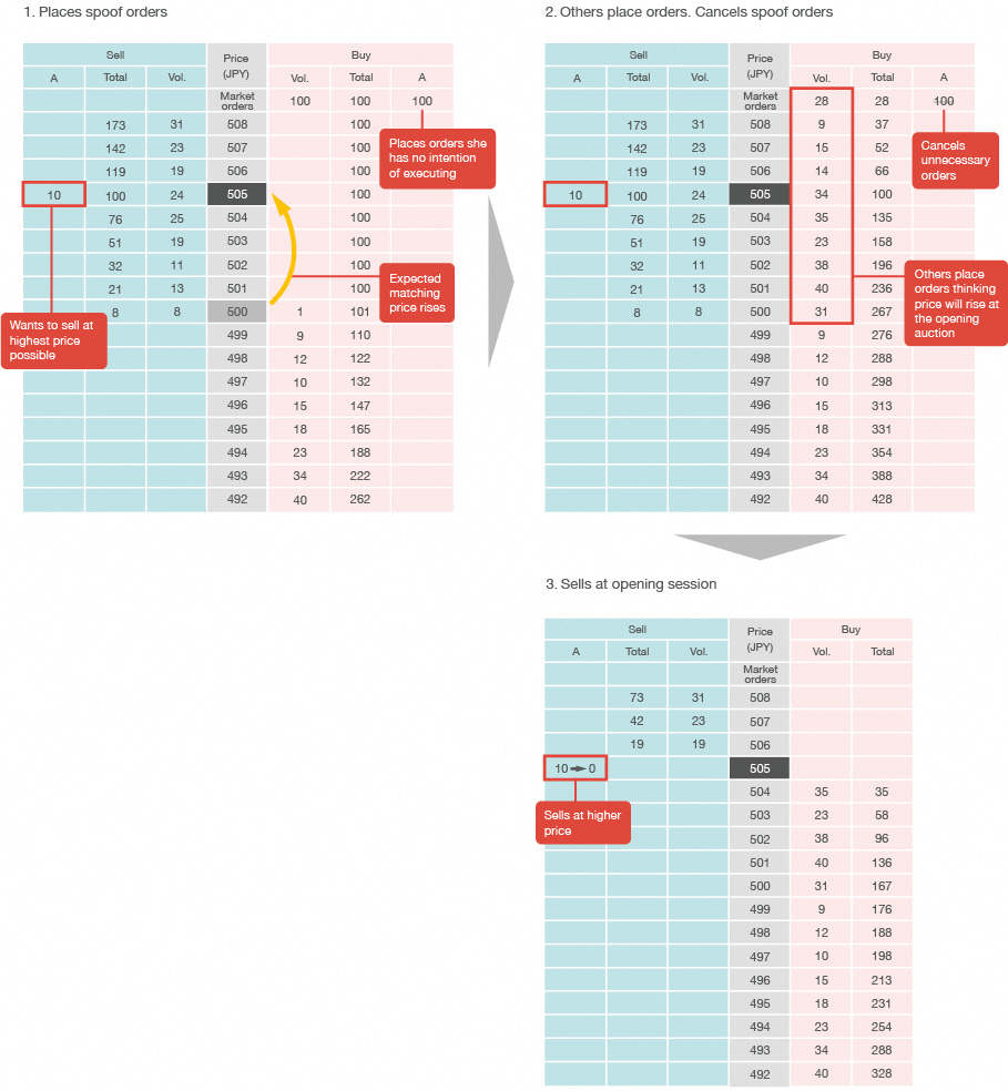 1. She raises the expected matching price to JPY 505 by placing 100 units of a "spoof" market buy order (an order which she has no intention of executing) before the opening auction. She also places 10 units of a sell order at JPY 505, JPY 5 higher than the original expected matching price.