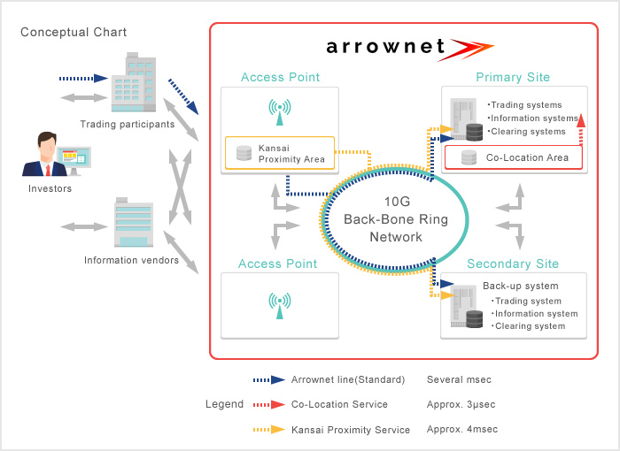 | Outline | JPX provides the network services for the Kansai Proximity Area where is operated by the designated data center operator adjacent to AP4. They provide trading participants, information vendors and ISVs, among others, with spaces to install devices with trading programs, etc., in the area. |