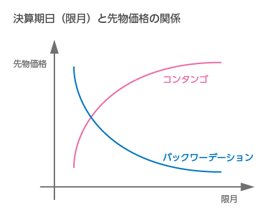 一般的に、限月までの期間が長ければ長いほど将来の価格の不確実性が増すことから、時間的価値は大きくなり、先物価格は高くなります。先の限月の先物ほど高い状態のことを「コンタンゴ」と呼びます。一方、先の限月の先物ほど安い、すなわち決済期日が短い(期近)価格の方が、決済期日が長い(期先)よりも高い状態のことを、「バックワーデーション」と言います。