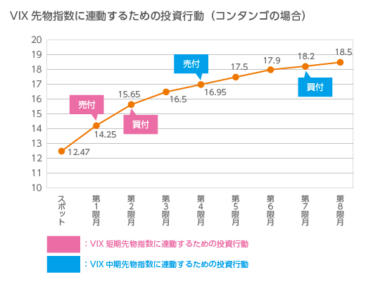 一般的なVIX先物指数は、第1限月の先物を売却し、第2限月の先物を買い付ける取引を定期的に行い、残存日数を一定期間に維持する取引を行った場合の収益率を指数化することにより算出されます。つまり、価格が安い期近の先物を売却(第1限月の先物を14.25ドルで売却)して、価格が高い期先の先物を買付ける(第2限月の先物を15.65ドルで買付ける)というロールオーバーを繰り返します。この状況では、VIX先物指数はVIX指数に対して継続的に減価していくこととなります。また、先物の時間的価値の影響は期近の限月の方が大きくなる傾向があります。そのため、時間的価値による先物指数の減少は、期近で運用するVIX短期先物指数の方が、期先で運用するVIX中期先物指数に比べて大きくなる傾向があります。