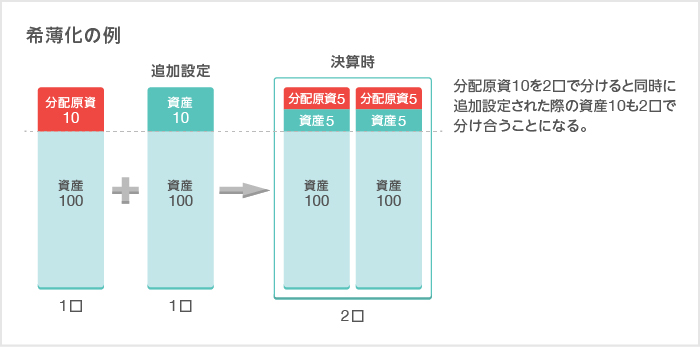 この場合、決算・分配時にはこの分配原資10を2口で分け合うため、1口当たりの分配金は5となります。これを分配金の希薄化と言います。