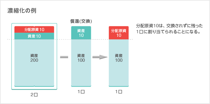 当初2口あたり210の資産のETFに10の分配原資が溜まって、1口当たりの純資産額が110になっていたとします。ここで1口交換をすると110の価額で交換することになり、110の資産を払った後、ETFは110の純資産総額(資産100と分配原資10)になります。分配原資は10から変わりがないため、決算、分配時における1口当たりの分配金は10となる分配金の濃縮化が発生します。