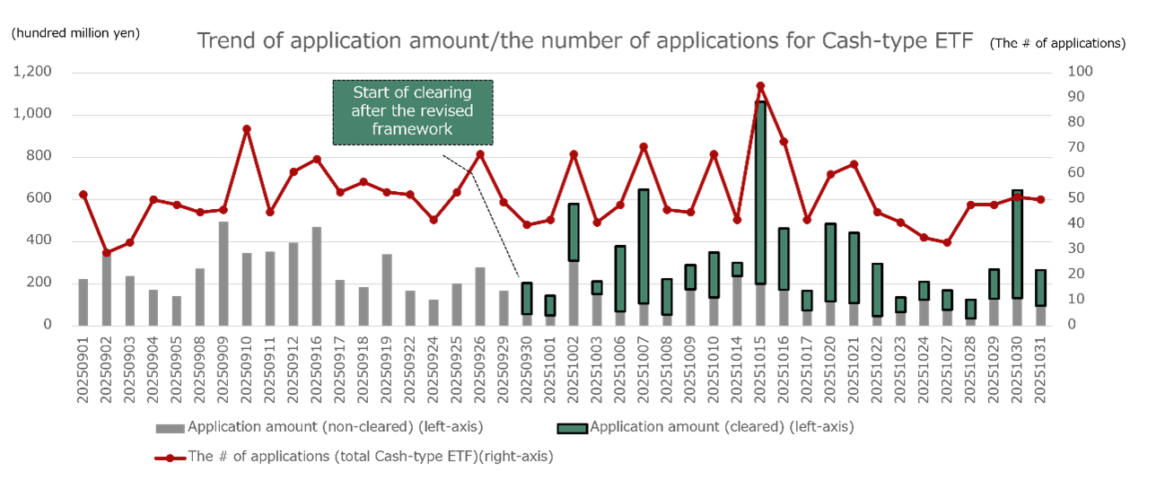 *2 Cleared value represents daily average in the period from September 29 to October 31, 2025. The ratio represents the ratio of cleared value to the total application amount on the ETF Creation/Redemption Platform (including new platform (“CredNex”) operated by Tokyo Stock Exchange).
