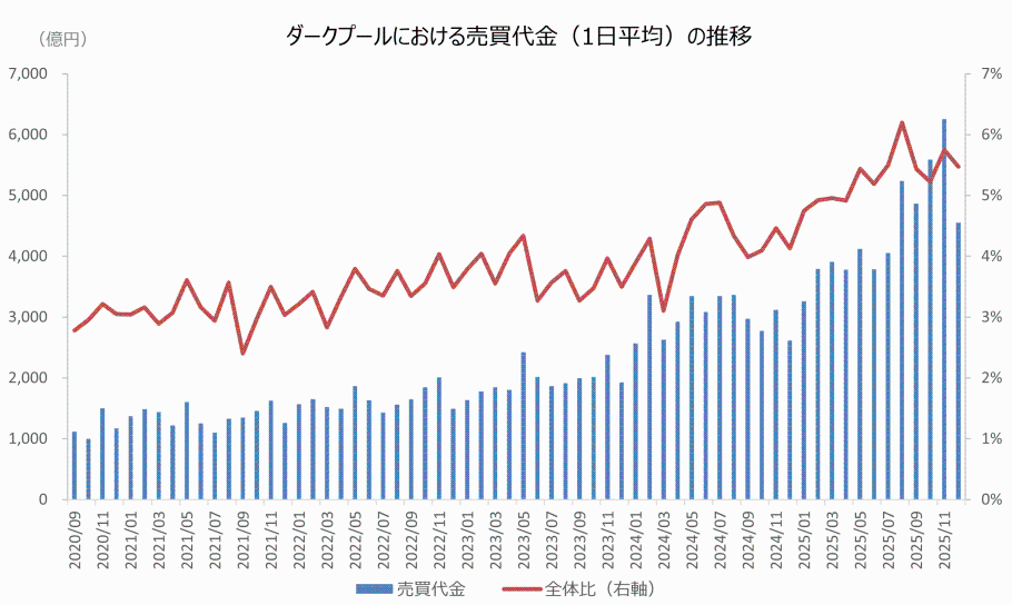 今般、当該フラグを元に、ダークプールにおける売買代金の推移(2020年9月~2025年12月)について取りまとめましたので、以下のとおりお知らせいたします。