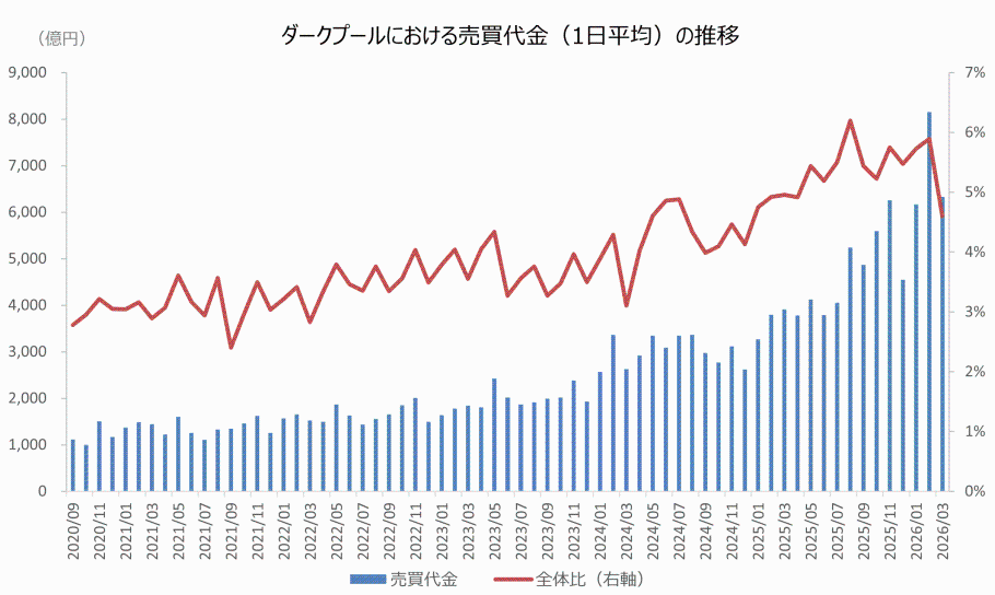 今般、当該フラグを元に、ダークプールにおける売買代金の推移(2020年9月~2026年3月)について取りまとめましたので、以下のとおりお知らせいたします。