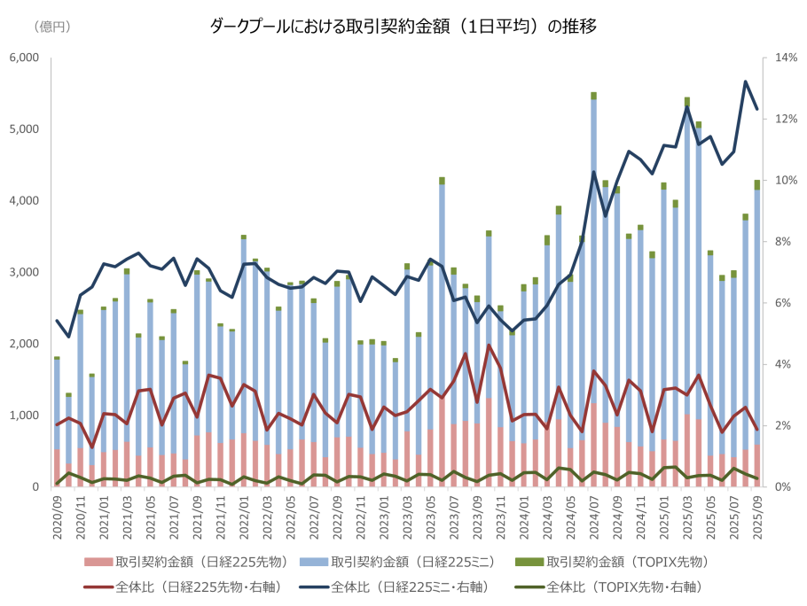 今般、当該フラグを元に、ダークプールにおける取引契約金額の推移(2020年9月~2025年9月)について取りまとめましたので、以下のとおりお知らせします。