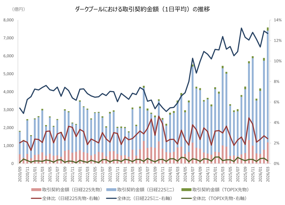 今般、当該フラグを元に、ダークプールにおける取引契約金額の推移(2020年9月~2026年3月)について取りまとめましたので、以下のとおりお知らせします。