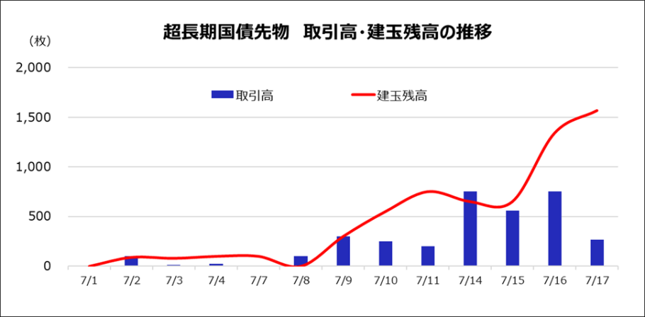 大阪取引所の超長期国債先物取引(ミニ)の取引高は、2025年7月14日及び7月16日にそれぞれ750枚(75億円)、建玉残高は7月17日に1,565枚(156.5億円)となり、取引高・建玉ともに、2014年4月7日の市場再開以来の最高を記録しました。