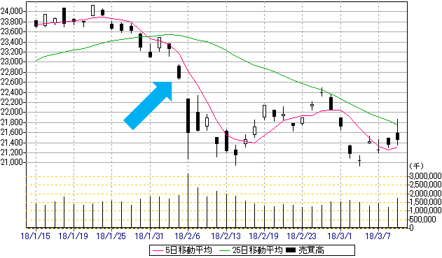 さて、チャートをみると、2月27日に22,500円近くまで上昇してしまっています。損切りの逆指値が入ってしまいました。この時点でポジションを閉じなければなりません。