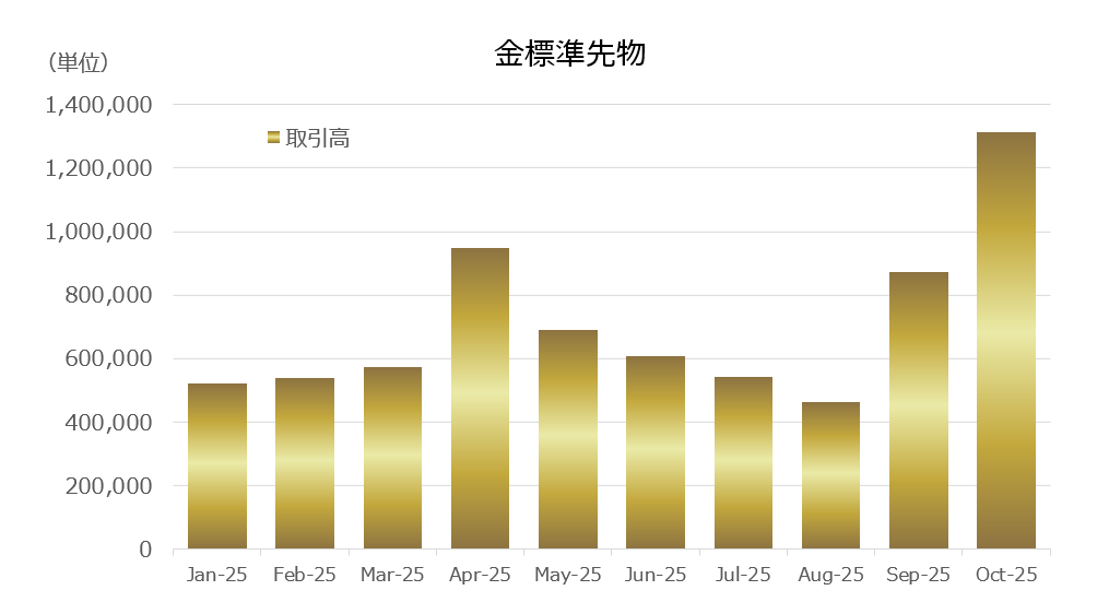 近年、金の価格高騰を背景に、大阪取引所の金のデリバティブの多くの投資家様にご利用いただいており、2025年10月の金標準先物の月間取引高は1,313,205単位となり、2025年中の最高値を記録しました。