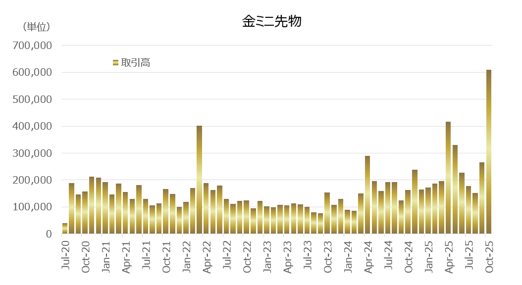 また、金ミニ先物の月間取引高は608,818単位となり、大阪取引所にて取引が開始された2020年7月以降、歴代最高値を更新しています。