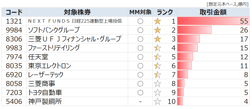 2025年2月の対象株券別の取引金額(想定元本ベース)ランキングにおけるTOP10は下表のとおりです。マーケットメイカーによる気配提示が行われている銘柄(※)が上位を占めております。