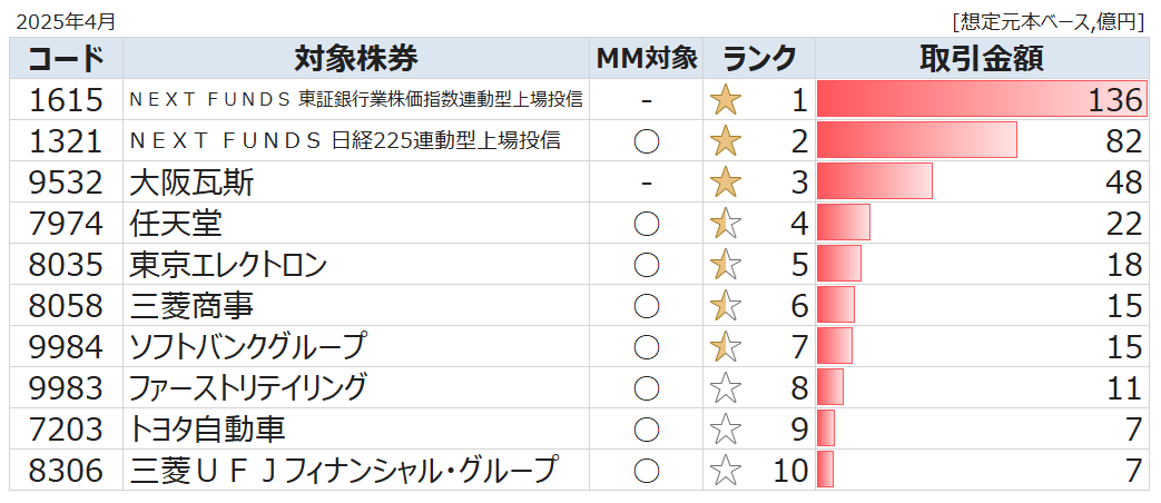 2025年4月の対象株券別の取引金額(想定元本ベース)ランキングにおけるTOP10は下表のとおりです。