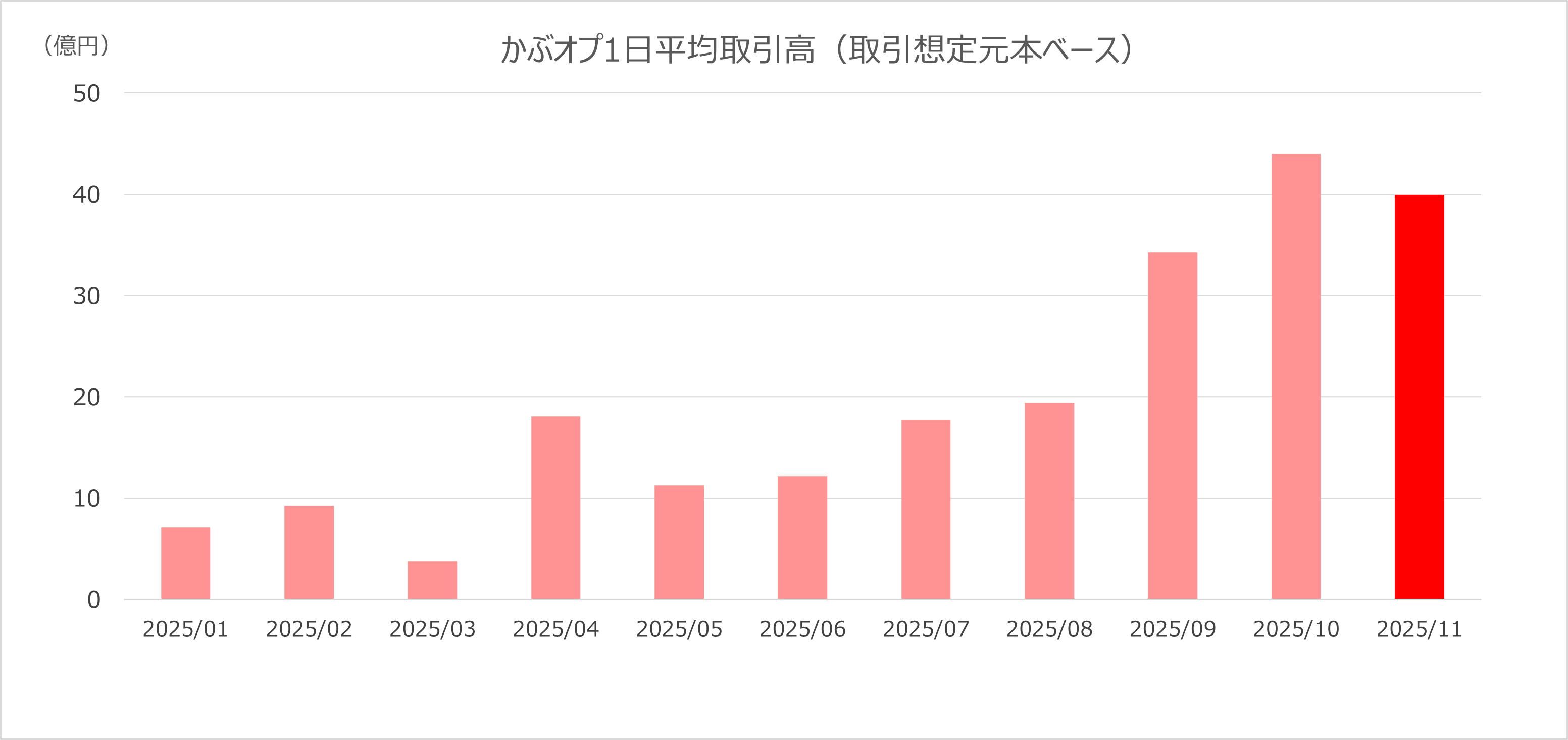 2025年11月は、かぶオプ取引の1日平均取引高(取引想定元本ベース)が約40億円となり、2014年の大阪取引所と東京証券取引所のデリバティブ市場統合以来歴代2位を記録しました。