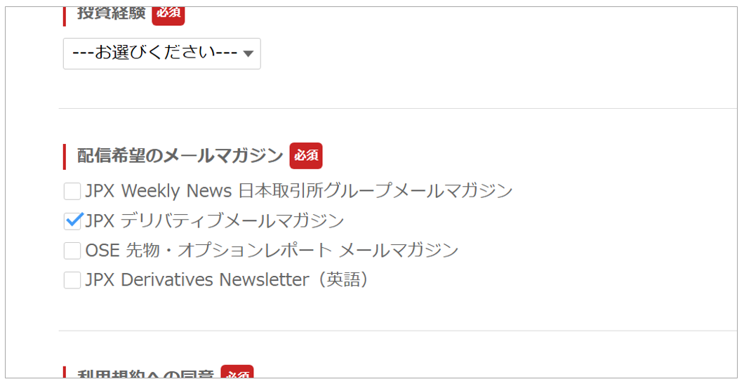 (2)「配信希望のメールマガジン」について「JPXデリバティブメールマガジン」を選択して、その他の箇所はフォームにそって入力いただきお申込みください。