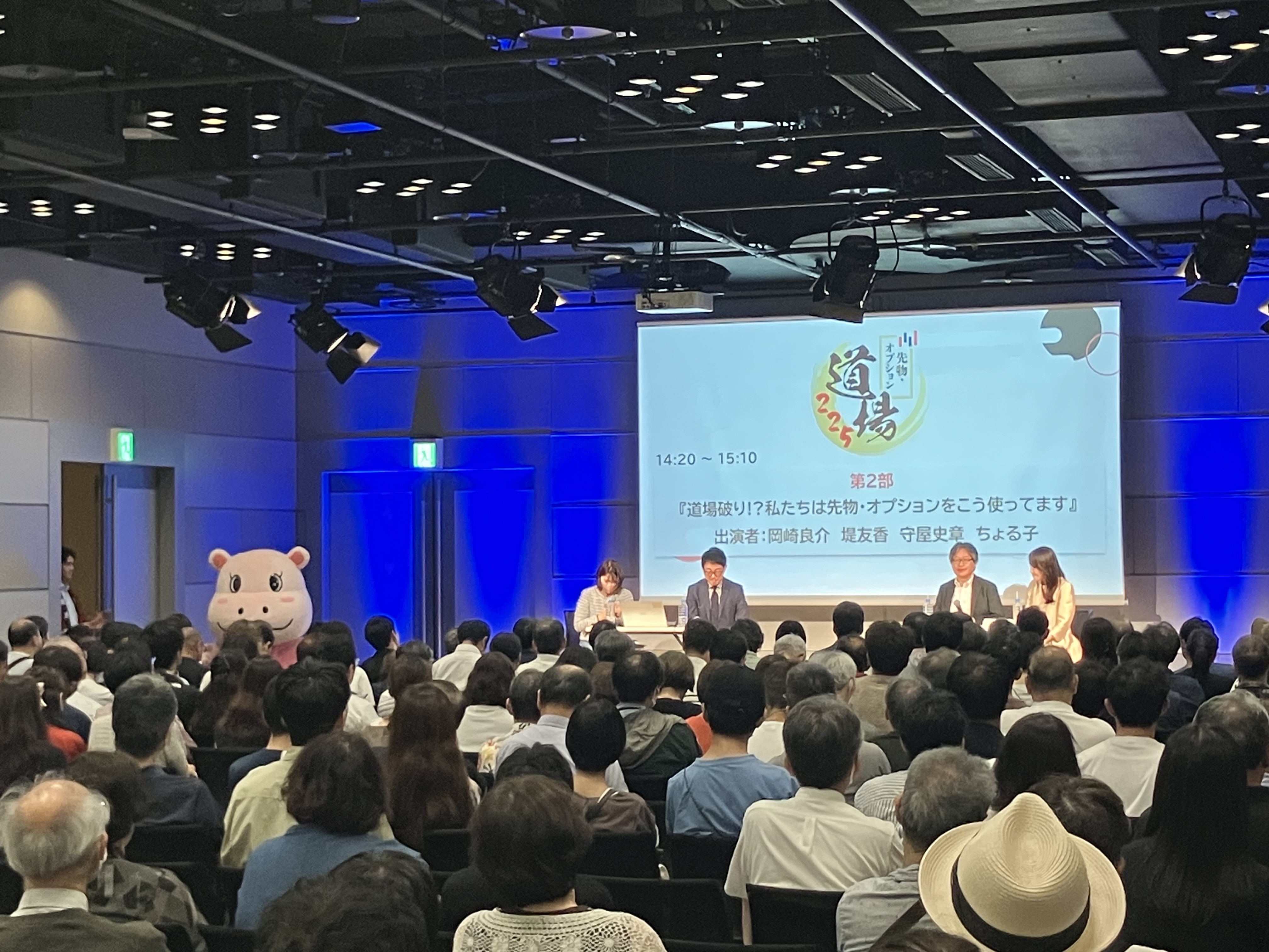 当日は、岡崎良介師範と堤友香キャスターによる番組同様の軽快なやりとりで、先物・オプションの基本から応用までを200名超のお客様とともに“段位認定”風に学びました。さらに大阪特別編として守屋史章氏(オプショントレード普及協会 代表)とちょる子氏(個人投資家)も登場し、多様な視点から先物やオプションについて理解を深めていただけるイベントとなりました。