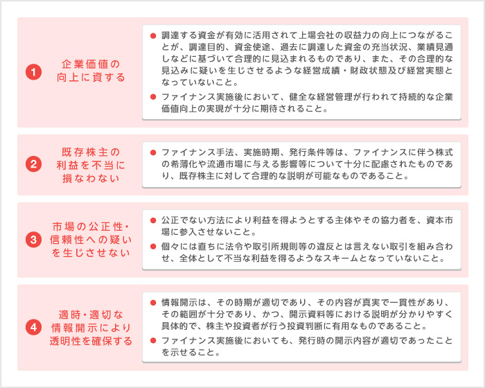 4つの原則から構成されます。その内容は、エクイティ・ファイナンスに係る法令・規則等の趣旨や精神を整理、具体化し、これに当法人が自主規制業務を行う中で蓄積されてきた観点を付加したものです。いずれも、資本市場に関わる者において従前より共有されているべき基本的な原則です。