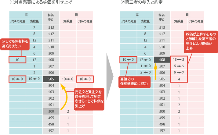 ①売注文と買注文(いずれも505円に10単位)を自ら発注して約定(対当売買)させることで、株価を505円に引き上げる。併せて現在値より8円高い508円で10単位の売注文を発注。
